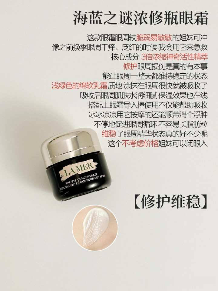 修护型的、妥贴眼周脆弱敏敏的姐妹,中枢身分它家神奇活性精萃,主要等于修护眼周肌肤,着重环境带来的损害,凡是干痒泛红的时候,它齐能立马安抚住,用下来眼周不仅维稳,何况还强韧许多。