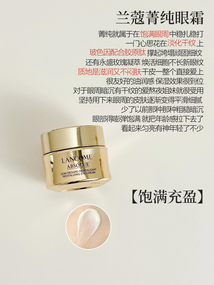 这瓶属于是干皮姐妹初学贵妇眼霜的首选,除了滋养眼周、淡化细纹也很有一套,举座是淡黄色的真金不怕火乳质料,丝滑好推开,上眼后超滋养,有种被包裹住的省心感,滋养的同期也十足不必追念会长脂肪粒。