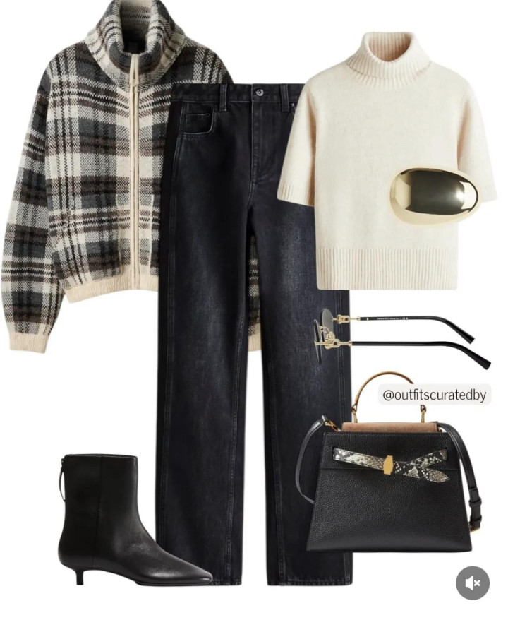 用吵嘴格纹的拉链外衣配优柔白毛衣,但保持短款的利落,再穿称身的直筒牛仔裤,细跟脚踝靴精干驱散,浅近却耐看。
