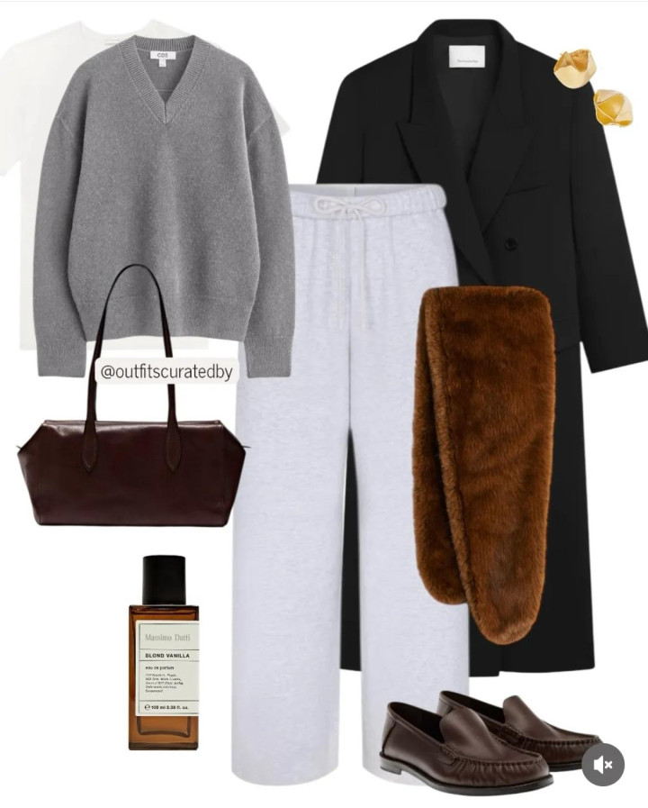 即使悠闲风也能穿出气场哦,为浅灰通顺卫裤搭一件修长款大衣,玄色配直线,让好版型充分发挥上风,V字领的小毛衫和软牛皮平底鞋是加分单品哦。