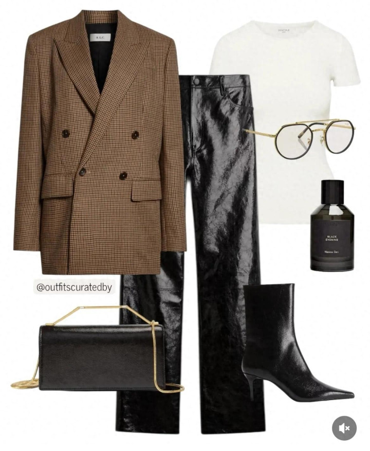 中长款的双排扣西装是修身利落必备,搭条皮裤有清明还很利落,再配双细跟脚踝靴,穿出安稳办事范儿干练。
