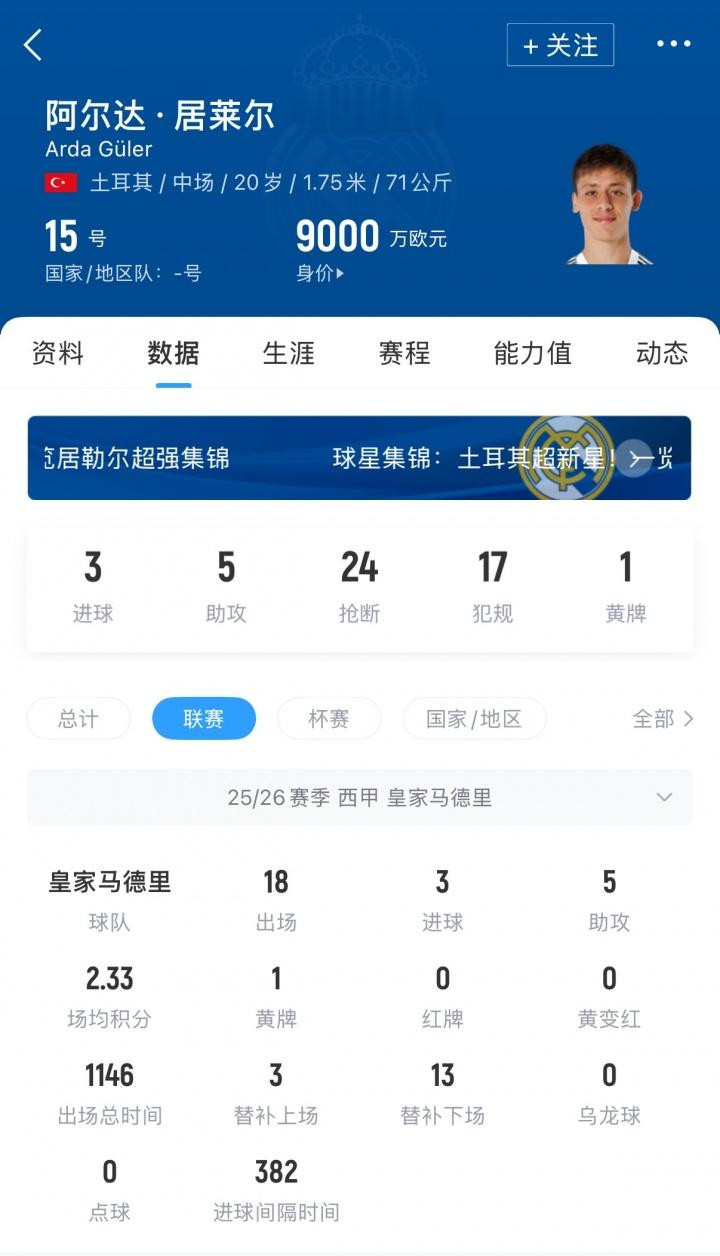 而居莱尔亦然第一个达到9000万欧元身价的土耳其球员,本赛季这位20岁的皇马中场出战25次,孝敬3球7助。